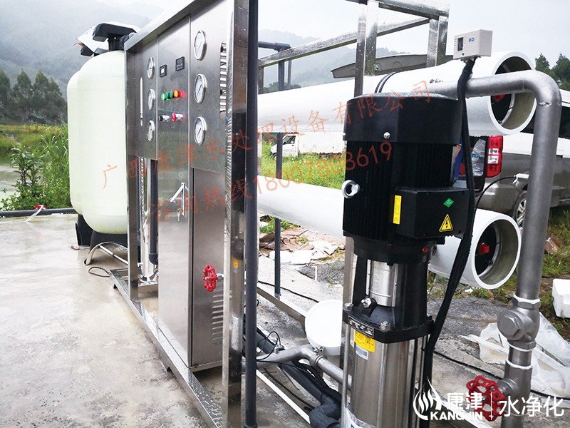 工藝流程:山泉水-原水箱-原水泵-石英砂過濾器-活性炭過濾器-阻垢劑加藥裝置-保安過濾器-高壓泵-反滲透裝置-用水點