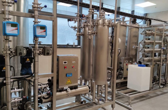 工藝流程:原水箱-原水泵-石英砂過濾器-活性炭過濾器-精密過濾器-紫外線殺菌器-增壓泵-反滲透膜組-加藥系統(tǒng)-無菌水箱-紫外線消毒殺菌器-除菌過濾器-變頻恒壓供水系統(tǒng)-用水點